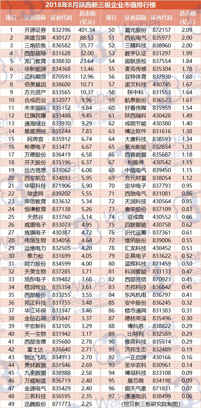附:2018年8月陜西新三板企業(yè)市值排行榜