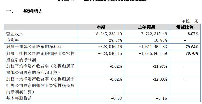 報告期內,公司實現(xiàn)營業(yè)收入 8,345,333.10 元,虧損-328,046.16 元。公司目前盈利能力較弱,抗風險能力較差,若未來不能及時改善盈利能力,可能對公司經營發(fā)展產生不利影響。