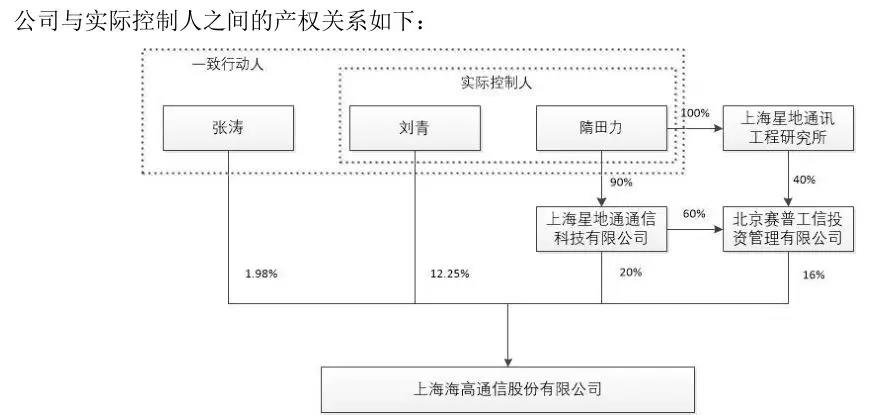 由于股權(quán)較分散,海高通信目前沒有控股股東,第一大股東上海星地通通信有限公司持有海高通信20%的股份,實控人為隋田力和劉青,劉青是隋田力小舅子的老婆。同時,劉青的配偶張濤與上述二人為一致行動人。