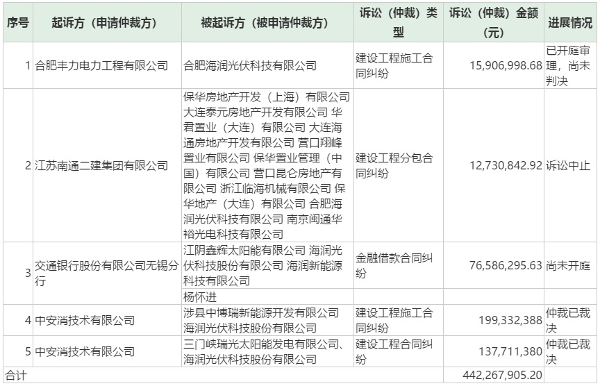 據(jù)ST海潤最新公告顯示,截至目前,公司均作為被告方,累計涉及5起重大訴訟,涉案金額4.96億元。其中,一起訴訟在開庭審理階段,一起訴訟中止,一起尚未開庭,兩起通過仲裁已裁決。