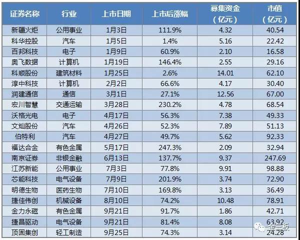 統(tǒng)計(jì)顯示,20家新三板公司,通過首次公開發(fā)行,合計(jì)募資122億元(凈額),融資最多的科順股份14億元,最少的金力永磁也有1.86億元。
