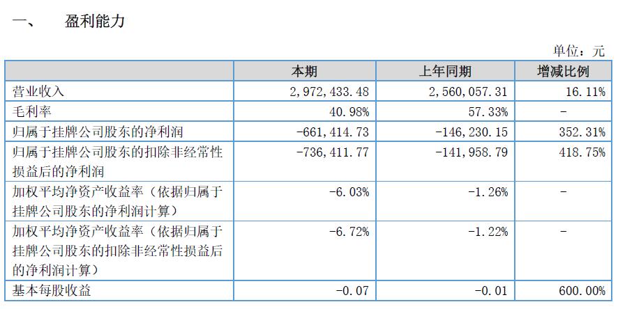1、報告期內(nèi),公司實現(xiàn)銷售收入297.24 萬元,比上年同期相比提高16.11%;資產(chǎn)總計1,218.93萬元,凈資產(chǎn)1,063.24 萬元,與上年同期相比略有下降;凈利潤-66.14 萬元,虧損較上年增加352.31%。與去年同期相比公司虧損增加主要是由于新開發(fā)的集成業(yè)務(wù)毛利率較低,使得營業(yè)成本增加;同時,公司加大研發(fā)投入,研發(fā)費用增加;最后,公司為符合公司的業(yè)務(wù)發(fā)展更換主辦券商,使得公司的審計咨詢費、證券顧問費大幅增加所致。