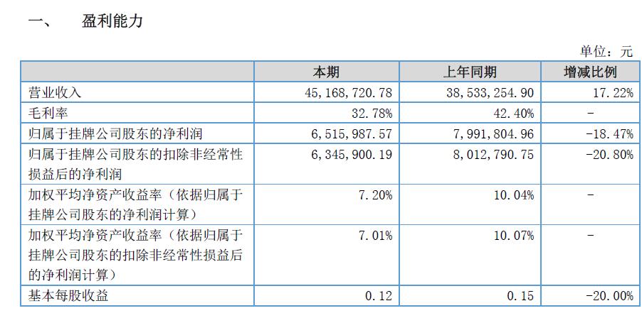 報(bào)告期內(nèi)實(shí)現(xiàn)營(yíng)業(yè)收入45,168,720.78 元,同比增長(zhǎng)17.22%,營(yíng)業(yè)成本30,363,278.37 元,同比增長(zhǎng)36.81%,凈利潤(rùn)6,515,987.57 元,同比減少18.47%。