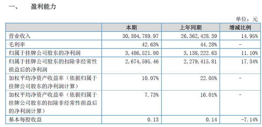 報(bào)告期內(nèi),公司總體經(jīng)營(yíng)情況良好,營(yíng)業(yè)收入和利潤(rùn)均有較大幅度增長(zhǎng)。2018 年1-6 月實(shí)現(xiàn)營(yíng)業(yè)收入3030.48 萬元,較上年同期增長(zhǎng)14.95%;實(shí)現(xiàn)利潤(rùn)總額400.49 萬元,較上年同期增長(zhǎng)8.67%;實(shí)現(xiàn)歸屬于掛牌公司股東的凈利潤(rùn) 348.65 萬元,較上年同期增長(zhǎng)11.10%。