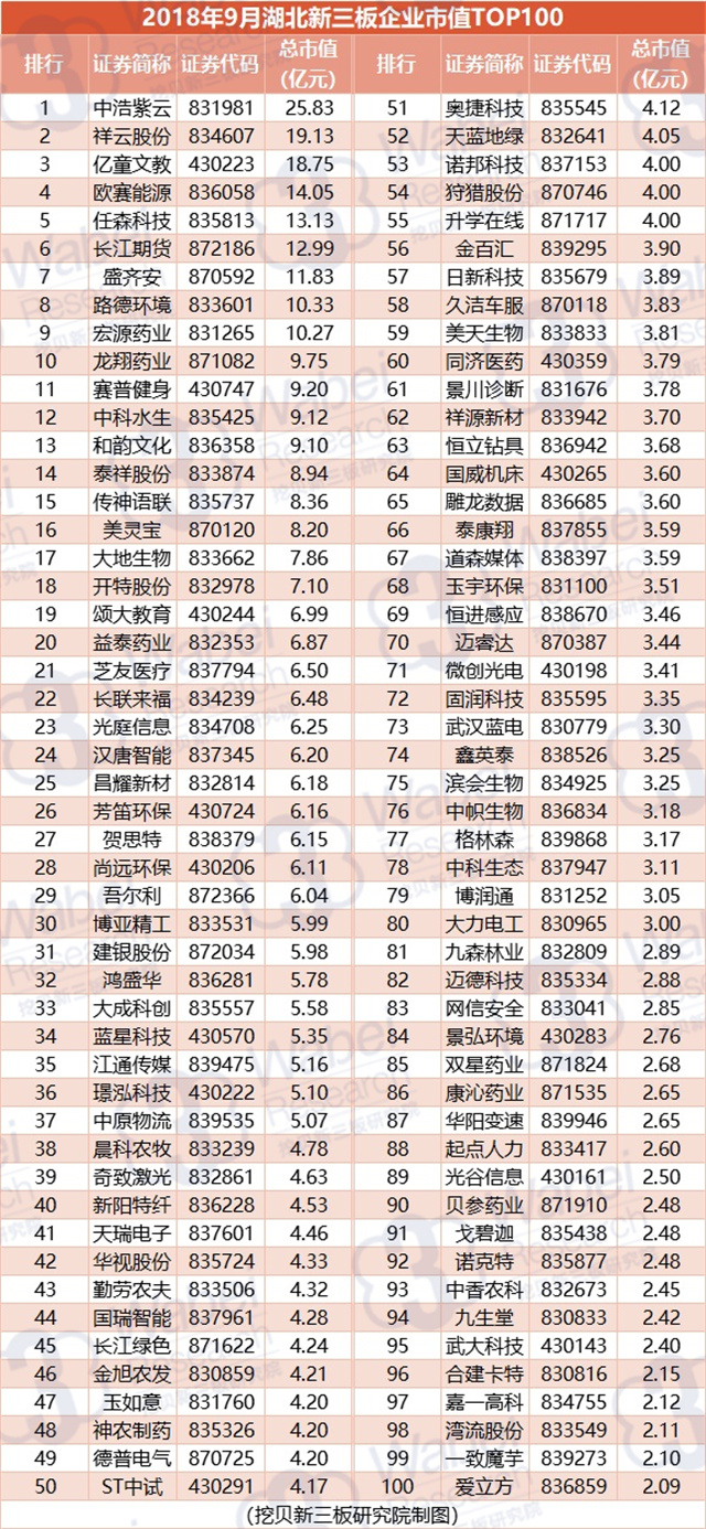 附:2018年9月湖北新三板企業(yè)市值TOP100