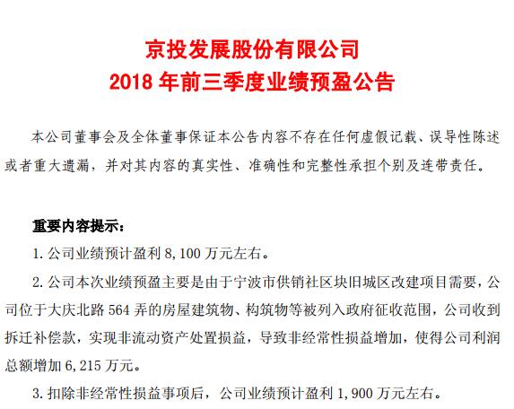 京投發(fā)展稱,根據(jù)估算,公司1-9月盈利8100萬(wàn)元左右。業(yè)績(jī)預(yù)盈主要是由于寧波市供銷社區(qū)塊舊城區(qū)改建項(xiàng)目需要,公司位于大慶北路564弄的房屋建筑物、構(gòu)筑物等被列入政府征收范圍,公司收到拆遷補(bǔ)償款,實(shí)現(xiàn)非流動(dòng)資產(chǎn)處置損益,導(dǎo)致非經(jīng)常性損益增加,使得公司利潤(rùn)總額增加6215萬(wàn)元。