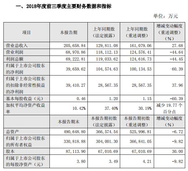 上年前三季度公司轉(zhuǎn)讓持有的北京北生研生物制品有限公司100%股權(quán)和長春祈健生物制品有限公司51%股權(quán),實(shí)現(xiàn)7.58億元的投資收益(稅后),主要受此影響,公司2018年前三季度同期(重述調(diào)整)對(duì)比,營業(yè)利潤、利潤總額、歸屬于上市公司股東的凈利潤、基本每股收益呈現(xiàn)較大幅度下降。