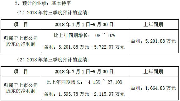 前三季度,盈利為5201.88萬(wàn)元–5722.07萬(wàn)元,比上年同期增長(zhǎng)為0%—10%,去年同期為5201.88萬(wàn)元。