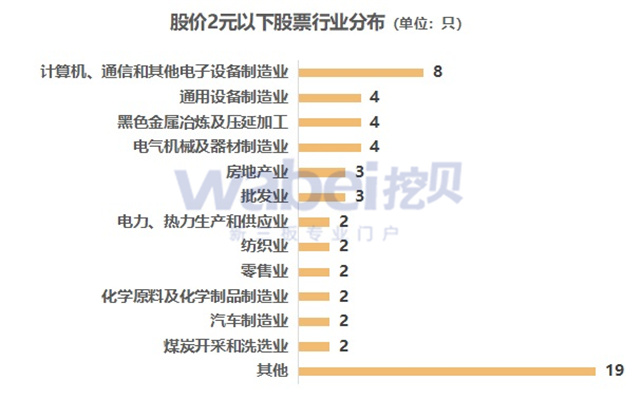 從行業(yè)分布看,計(jì)算機(jī)、通信和其他電子設(shè)備制造業(yè)中,股價(jià)低于2元的股票最多,有8只;其次是通用設(shè)備制造業(yè)、黑色金屬冶煉及壓延加工、電氣機(jī)械及器材制造業(yè),均有4只。