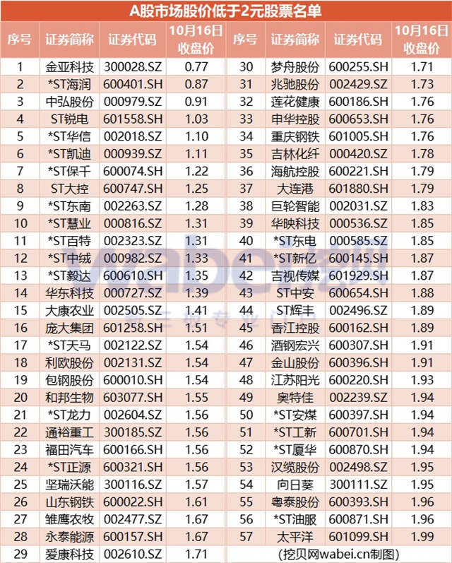 據(jù)挖貝研究院數(shù)據(jù)顯示,截止到10月16日收盤,A股市場(chǎng)上股價(jià)低于2元的股票共57只。對(duì)比一個(gè)月前(9月17日),股價(jià)低于2元的股票共31只。