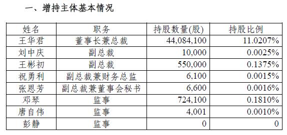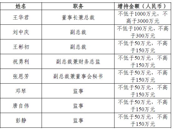 公告稱,董事長(zhǎng)兼總裁王華君、副總裁劉中慶、副總裁王彬初、副總裁兼財(cái)務(wù)總監(jiān)祝勇利、副總裁兼董事會(huì)秘書張恩芳、監(jiān)事鄧琴、監(jiān)事唐自偉、監(jiān)事彭靜將增持,其中王華君增持金額不低于1000萬不高于3000萬,其他高管增持金額都不低于50萬。