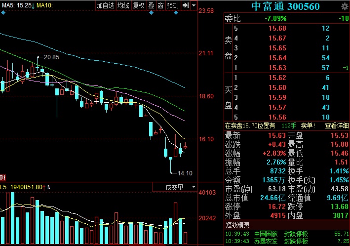 今日,中富通股票高開(kāi)并保持高位震蕩,截至發(fā)稿,股價(jià)為15.63元/股,漲2.83%。