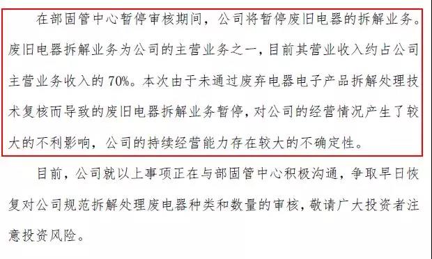 金科環(huán)保稱,在部固管中心暫停審核期間,公司將暫停廢舊電器拆解業(yè)務(wù),對(duì)公司的經(jīng)營(yíng)情況產(chǎn)生了較大的不利影響,公司的持續(xù)經(jīng)營(yíng)能力存在較大的不確定性。