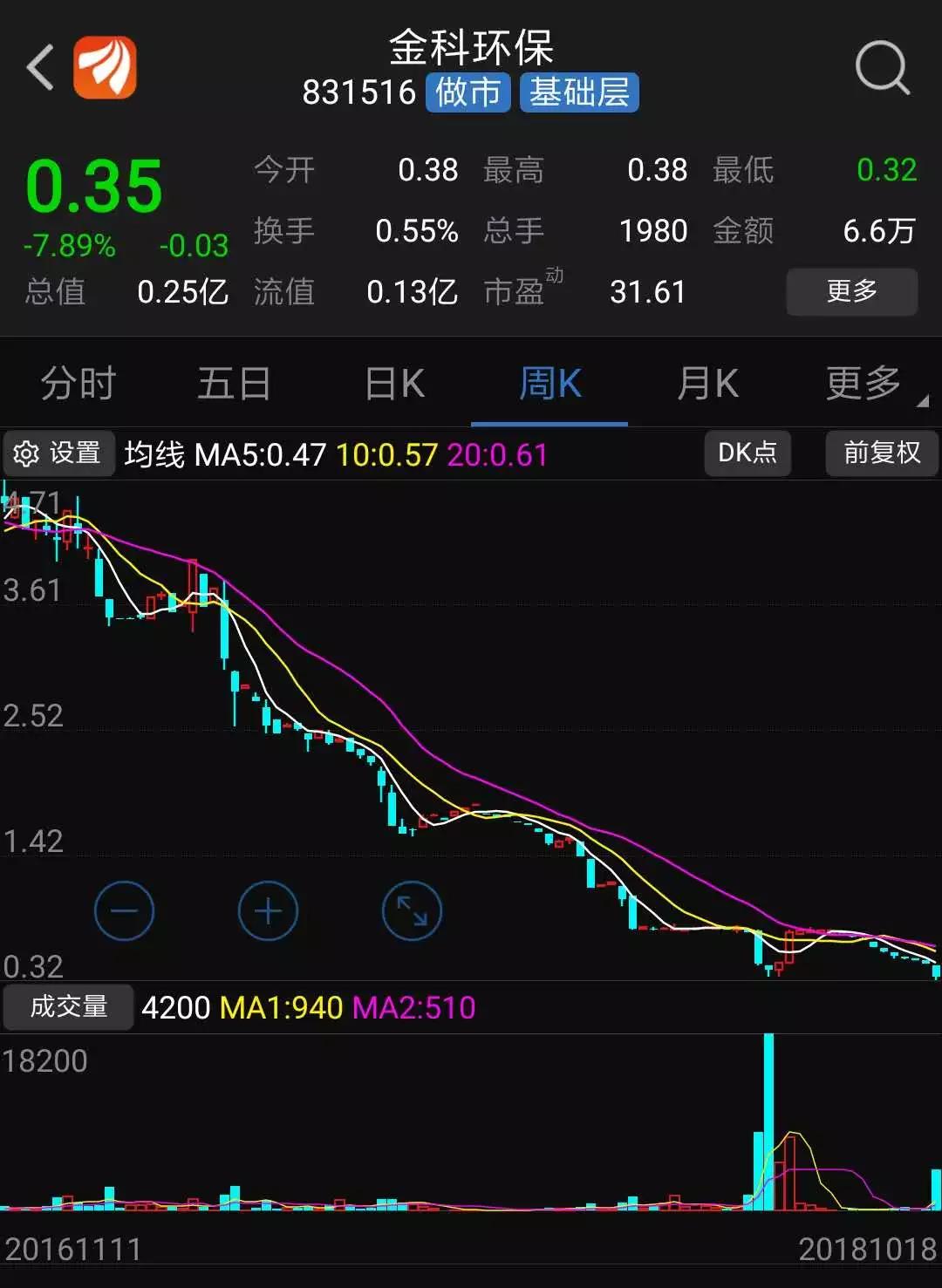 自2016年以來(lái),金科環(huán)保股價(jià)一直持續(xù)走低。2016年12月30日,金科環(huán)保收盤(pán)價(jià)為4.23元/股,至今跌幅超過(guò)90%。10月18日金科環(huán)保收盤(pán)價(jià)為0.35元/股,跌幅為7.89%,成交6.63萬(wàn)元。