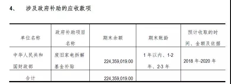 而2018年半年報(bào)顯示,報(bào)告期末,公司應(yīng)收廢舊家電拆解基金補(bǔ)貼高達(dá)2.24億元,賬齡最長(zhǎng)為2-3年。公司預(yù)計(jì)將在2018年-2020年收回這些基金補(bǔ)貼款。