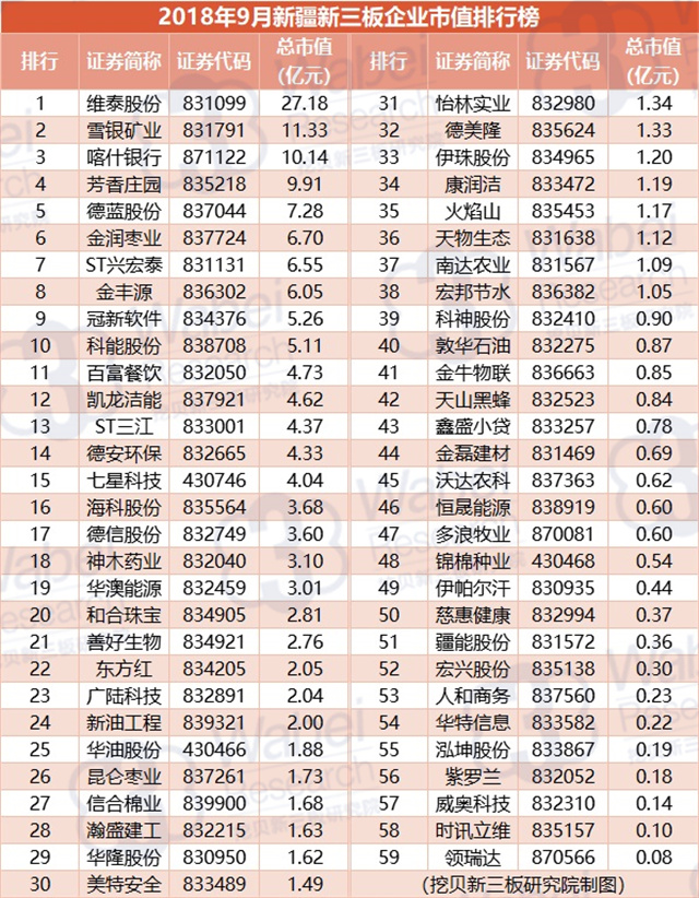 附:2018年9月新疆新三板企業(yè)市值排行榜
