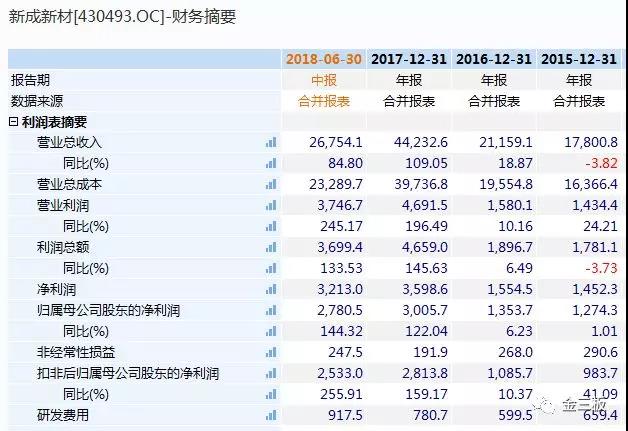 比如新成新材(430493.OC),主營業(yè)務(wù)為特種石墨的研發(fā)、生產(chǎn)、銷售以及相關(guān)加工業(yè)務(wù)。特種石墨屬于國家七大新興戰(zhàn)略產(chǎn)業(yè)中的新材料產(chǎn)業(yè),具有廣闊發(fā)展空間,公司產(chǎn)品和外加工業(yè)務(wù)處于供不應(yīng)求的狀態(tài),2018年上半年產(chǎn)銷狀態(tài)良好,凈利潤高達3212.98萬元,連續(xù)兩年業(yè)績實現(xiàn)翻倍增長。