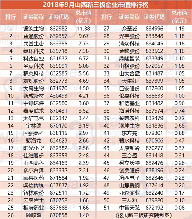 附:2018年9月山西新三板企業(yè)市值排行榜