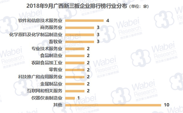 從行業(yè)分布來看,軟件和信息技術服務業(yè)上榜企業(yè)數(shù)量最多,有4家企業(yè);其次是商務服務業(yè)、化學原料及化學制品制造業(yè)、畜牧業(yè),均有3家企業(yè)。(來源:挖貝新三板研究院)