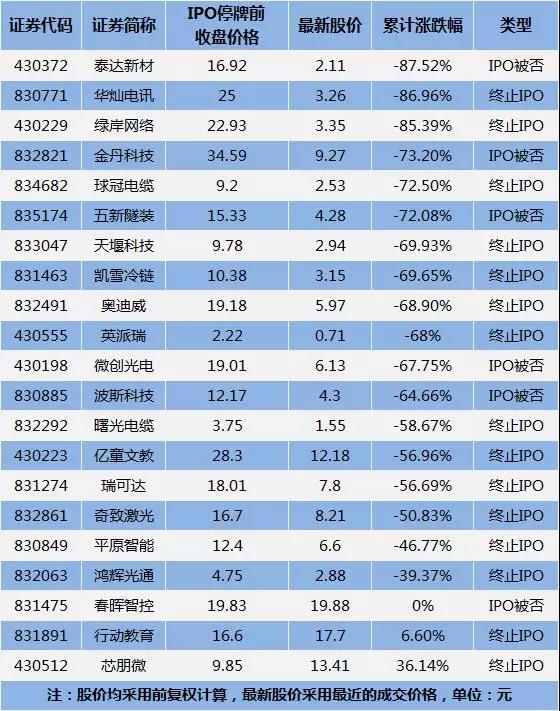 出去摘牌以及無成交的公司,剩下的公司中,那些曾經(jīng)采用過做市轉(zhuǎn)讓、股東人數(shù)較多的,在IPO失敗后復(fù)牌時(shí)大多都出現(xiàn)了暴跌。下跌50%基本屬于“正常水平”,多的跌幅會(huì)超過70%甚至80%。