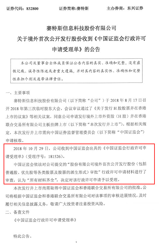 今年8月1日,賽特斯公告公司董事會審議通過了在香港聯(lián)交所主板申請上市的議案。10月29日,公司收到證監(jiān)會對其申請境外上市材料予以受理的通知。