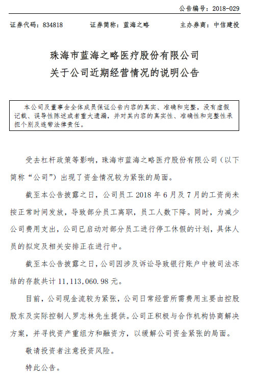 在8月21日,藍(lán)海之略曾發(fā)布公告,對公司最近的經(jīng)營情況進(jìn)行說明。公司稱,受去杠桿政策等影響,公司出現(xiàn)了資金較為緊張的局面。