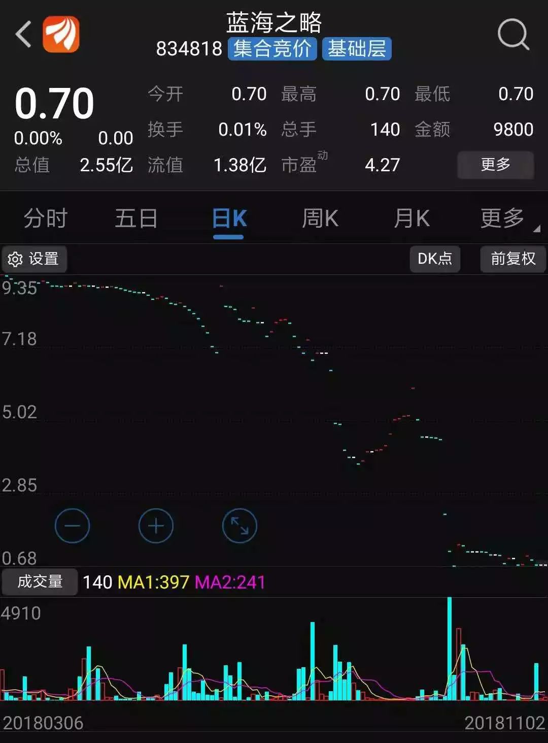 9月13日、9月14日,藍(lán)海之略連續(xù)兩個(gè)交易日下跌50%,均達(dá)到跌停價(jià),9月15日同樣暴跌38.74%。11月2日,藍(lán)海之略的收盤價(jià)僅為0.7元/股,較1月15日的9.35元/股下跌92.5%。