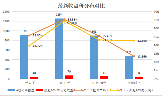 而在近20個交易日股價漲幅超20%的203家公司中,其中股價不足5億元的占比為19.7%;不足10元的占比54.19%。而這一比例還低于市場整體比例。表明,近期超跌低價股雖然漲勢“喜人”,但是市場上超跌的太多了,很多低價股并未啟動。