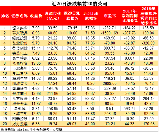 金證互通旗下的牛牛金融研究中心統(tǒng)計發(fā)現(xiàn),自指數(shù)探底以來,近20個交易日共有19家公司股價漲幅超50%,其中恒立實業(yè)與群興玩具實現(xiàn)翻倍。這20家公司多數(shù)在本周漲幅巨大。仔細分析發(fā)現(xiàn),近20個交易日漲幅前20的公司,11家公司市盈率高于30倍,7家是負的市盈率;2017年僅9家公司實現(xiàn)凈利潤同比正增長,2018年3季報則僅8家盈利增長。也就是說,這些公司要么就是高估值,要么就是業(yè)績差。