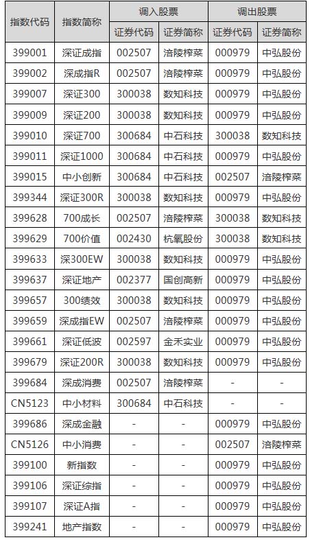 挖貝網(wǎng)訊11月14日中午,深交所發(fā)布《關于調(diào)整深證成指等指數(shù)樣本股的公告》,中弘股份(000979)由于即將終止上市被踢出,涪陵榨菜被調(diào)入。