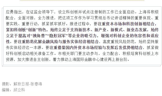 上海市領導指出,在證監(jiān)會領導下,設立科創(chuàng)板并試點注冊制的工作已全面啟動。上海將積極配合,全面對接,全力推進。推進過程中,要注重資本市場和科技創(chuàng)新相結合,緊扣科創(chuàng)板“創(chuàng)新”特色,始終立足于支持新技術、新產(chǎn)業(yè)、新模式、新業(yè)態(tài)發(fā)展,始終立足于提高對“獨角獸”“隱形冠軍”等企業(yè)的吸引力,增強對科創(chuàng)企業(yè)的包容性和適應性。要注重防范化解金融風險與服務實體經(jīng)濟相結合,高度重視風險防范,始終堅持服務實體經(jīng)濟這一本源。要注重借鑒國內外資本市場經(jīng)驗與發(fā)揮后發(fā)優(yōu)勢相結合,抓緊做好科創(chuàng)板啟動相關準備工作。市相關部門要主動參與,全力配合,積極培育科創(chuàng)板上市資源,加大推進自主創(chuàng)新,著力推動上海國際金融中心建設再上新臺階。