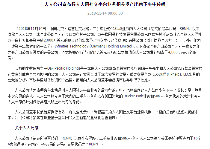 11月14日早上8點,運營社交網(wǎng)絡(luò)、二手車業(yè)務(wù)和SaaS業(yè)務(wù)的人人公司,通過人人網(wǎng)公布了一則消息。